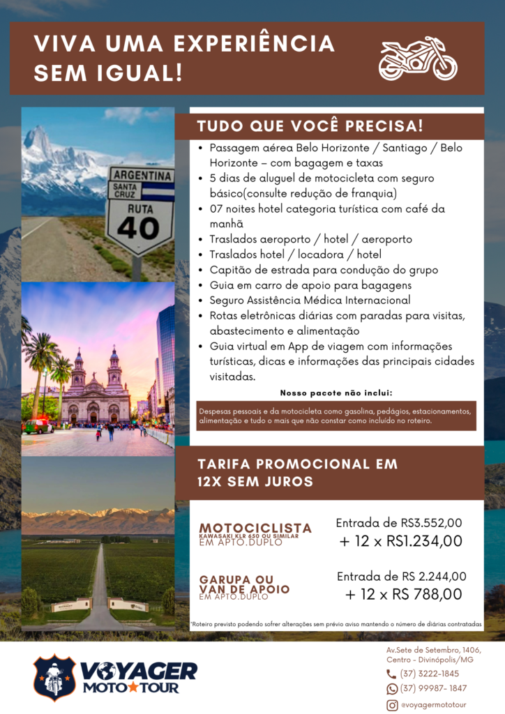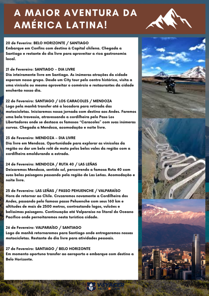 Próximas Viagens CORDILHEIRAS DOS ANDES – 2027 1 semana atráspor Voyager Mototour Quer saber mais? Entre em contato pelo Whatsapp: