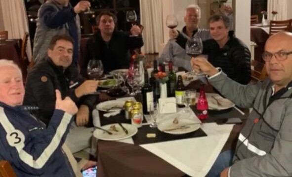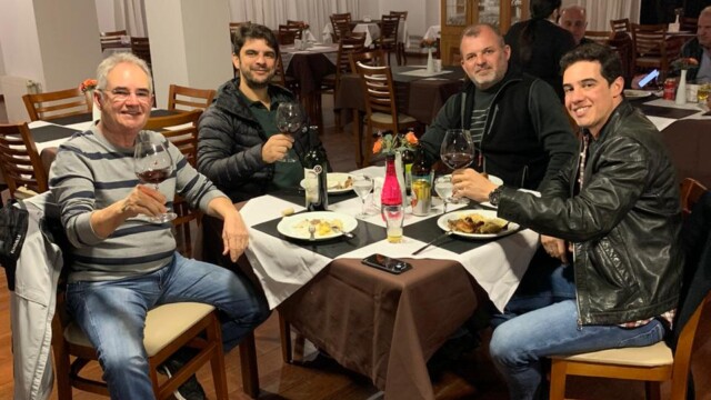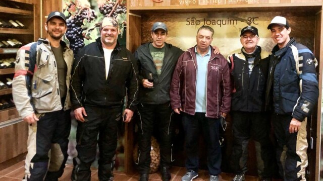 De Curitiba fomos experimentar o frio da Serra Catarinense. São Joaquim era a próxima parada. A chegada foi belíssima, no alto da serra, com um céu azul e já esfriando. Tudo perfeito, se não fosse por uma pedra no meio do caminho. Aliás, a única pedra durante mais de 3.000 km. Felizmente nosso Sargento Alexandre, que filmava a equipe, conseguiu, com perícia, controlar a moto, segurar o celular e garantir a filmagem, tudo sem cair. Mas a roda da Kawasaki sofreu, amassou mas foi rapidamente restaurada. Em São Joaquim fizemos nosso jantar de confraternização, depois da compra de vinhos tradicionais da região. O Comendador, em pessoa, experiente na arte de vender o próprio peixe, faturou alto naquele dia.