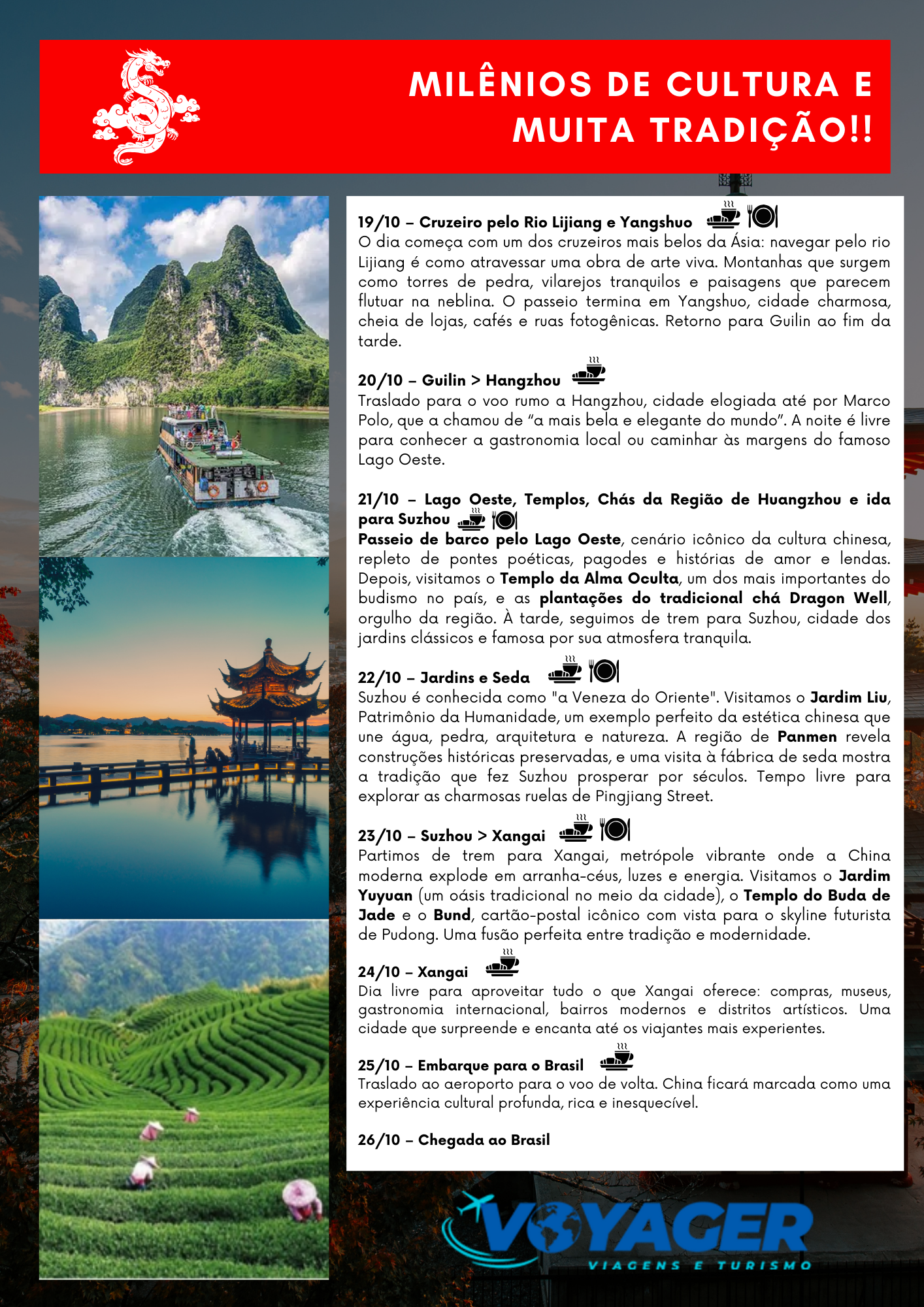 De Pequim a Xangai, passando por Xi’an, Guilin, Hangzhou e Suzhou, o percurso conecta antigos impérios, paisagens naturais quase irreais e cidades que foram decisivas para a formação cultural e econômica do Oriente. Cada deslocamento e cada visita foram pensados para oferecer uma leitura clara da diversidade chinesa, sem pressa, com profundidade e significado.